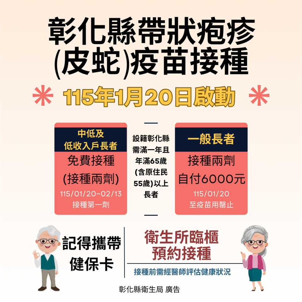 新聞焦點 彰化長者福音:1萬人2萬劑帶狀疱疹疫苗 1月20日起開打 發布日期 2026/01/16~2026/02/16 | 發佈單位: 衛生局疾病管制科 | 發佈日期: 林小姐 04-7115141 | 更新日期 2026/01/15 | 瀏覽人數: 6人 《置頂》 為降低高齡族群罹患帶狀疱疹(俗稱皮蛇)及其併發症風險,提升長者健康防護力,彰化縣帶狀疱疹疫苗(皮蛇)接種計畫將自115年1月20日起正式啟動,彰化縣長王惠美呼籲符合資格之長者盡快完成預約與接種,以提升個人保護力。 彰化縣衛生局表示,帶狀疱疹係由水痘-帶狀疱疹病毒引起,好發於長者或免疫力較低族群,發病時常伴隨劇烈疼痛,部分個案可能產生長期神經痛等後遺症,嚴重影響生活品質。透過接種疫苗,可有效降低發病及併發症風險,建議符合資格者及早接種。 接種計畫重點說明如下: 一、接種時間:自115年1月20日起,依各鄉鎮市衛生所公告時程辦理。 二、接種對象:彰化縣設籍滿1年之65歲以上長者(原住民為55歲以上)。 三、補助方式與接種期限 (一)低收入戶及中低收入戶長者:由縣府全額補助完成2劑接種,預約接種時間為115年1月20日至2月13日完成第1劑接種。 (二)一般符合資格長者:完成2劑接種須自付費用新臺幣6,000元(市價18,500-20,000元),不足部分由縣府補助,自115年1月20日起開放接種,至疫苗用罄為止。 四、一般長者接種流程說明 (一)攜帶接種者之健保卡,至衛生所臨櫃洽詢並辦理預約登記。 (二)由衛生所人員查驗資格,並說明疫苗接種相關注意事項。 (三)領取繳費單並簽署繳費意願書。 (四)需於7日內至銀行或超商完成繳費,超過7日繳費單即失效請重新預約。 (五)成功繳費後,請於收到「繳費成功簡訊通知」,或預約登記14日後,前往本縣轄內衛生所接種第1劑;並於第1劑接種滿3個月後完成第2劑接種。 衛生局補充,家屬或他人可協助代為辦理登記,每人每日限代辦2人;考量疫苗配賦問題,接種請至原預約登記之衛生所施打;提醒完成繳費後,不得請求退費或轉讓他人使用。也提醒本次疫苗數量有限,將依規定對象及疫苗供應情形辦理接種,符合資格之長者請把握時程,儘早洽詢所在地衛生所,以免向隅,相關接種資訊可洽各鄉鎮市衛生所或彰化縣衛生局。