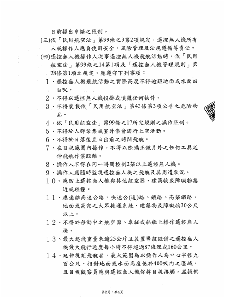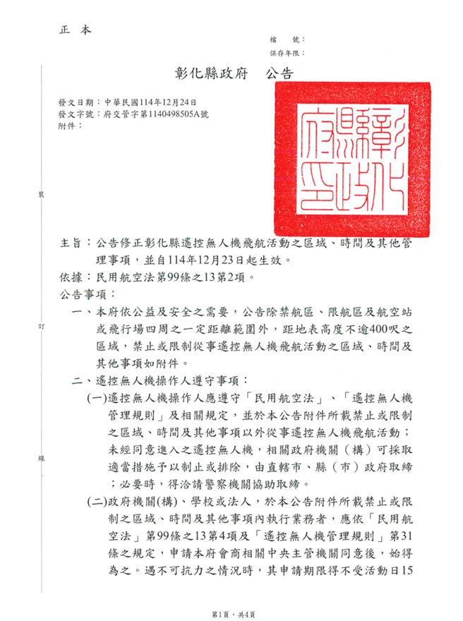 公告資訊 【公告】彰化縣政府修正「彰化縣遙控無人機飛航活動之區域、時間及其他管理事項」公告 發布日期 2025/12/30~2026/01/30 | 發佈單位: 新聞處新聞行政科 | 發佈日期: 林先生 7531956分機1956 | 更新日期 2025/12/30 | 瀏覽人數: 10人 本府依公益及安全之需要,公告除禁航區、限航區及航空站或飛行場四周之一定距離範圍外,距地表高度不逾400呎之區域,禁止或限制從事遙控無人機飛航活動之區域、時間及其他事項如附件。
