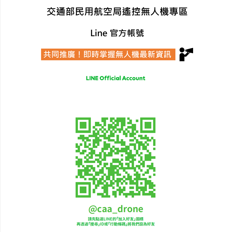 公告資訊 【轉知】交通部民用航空局遙控無人機專區官方Line帳號 發布日期 2026/01/12~2026/02/12 | 發佈單位: 新聞處新聞行政科 | 發佈日期: 林先生 7531956分機1956 | 更新日期 2026/01/12 | 瀏覽人數: 8人 附圖為交通部民用航空局遙控無人機專區Line官方帳號,定期推播禁限航區規範、最新法令資訊及違規案例解析,避免民眾因不熟悉法規而觸法,歡迎民眾多加利用。