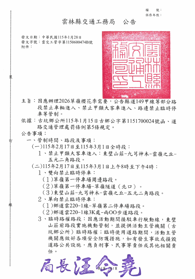 公告資訊 【轉知】2026草嶺櫻花季管制公告 發布日期 2026/02/02~2026/03/02 | 發佈單位: 新聞處新聞行政科 | 發佈日期: 林先生 7531956分機1956 | 更新日期 2026/02/02 | 瀏覽人數: 23人 因應2026草嶺櫻花季, 雲林縣政府發布縣道149甲線等部分路段禁止車輛進入、禁止甲類大客車進入、路邊禁止臨時停車等管制公告。