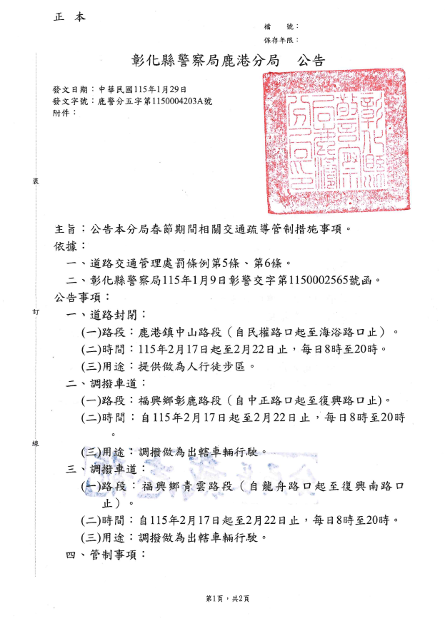 公告資訊 【轉知】彰化縣警察局鹿港分局春節期間相關交通疏導管制措施事項公告 發布日期 2026/02/05~2026/03/05 | 發佈單位: 新聞處新聞行政科 | 發佈日期: 林先生 7531956分機1956 | 更新日期 2026/02/05 | 瀏覽人數: 30人 本案於115年2月17日起至2月22日止,每日8時至20時(視狀況提前或延後),封閉鹿港鎮中山路段(自民權路口起至海浴路口止),做為行人徒步區,以維護行人安全。 為免封閉路段造成周邊道路車流壅塞,於中山路與民權路口、沿海、復興南、三民與菜園路口、青雲路與復興南路口、 彰鹿路與復興路口、彰鹿路與中正路口、中正路與舊鐵道口 、復興路與親民路口、彰30(媽祖路)、光復路與復興南路口 、中山路與海浴路口、復興路與鹿草路口、中正路與民權路口、中正路與鹿東路口設立交通管制點(視交通流量情形, 彈性調整交通疏導管制方式及時段)。