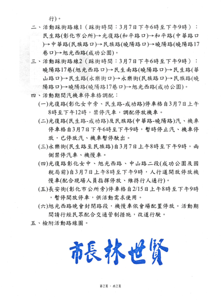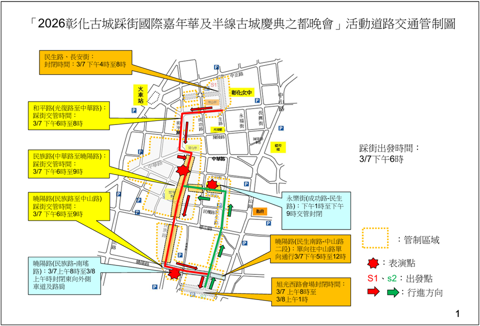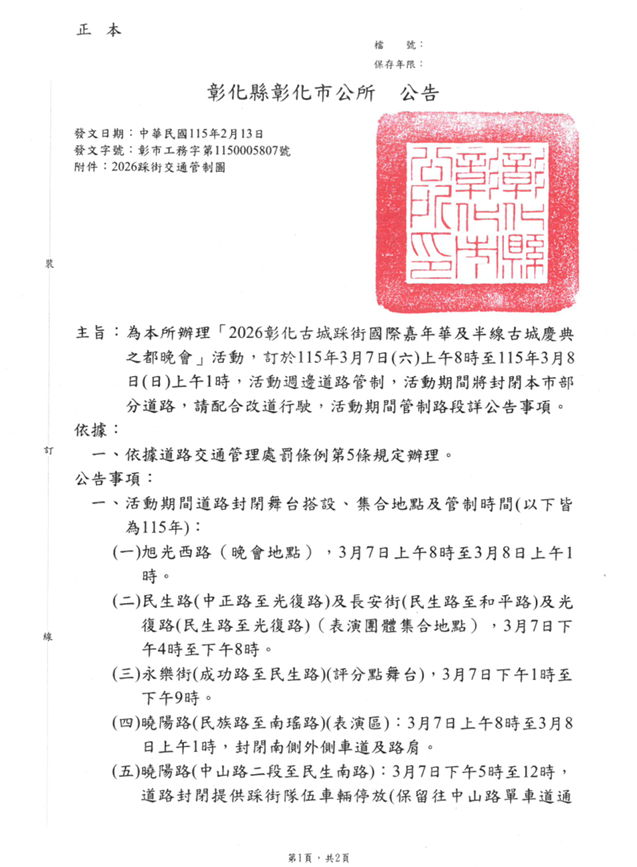 公告資訊 【轉知】2026彰化古城踩街國際嘉年華及半線古城慶典之都晚會交通管制措施公告 發布日期 2026/03/03~2026/04/03 | 發佈單位: 新聞處新聞行政科 | 發佈日期: 林先生 7531956分機1956 | 更新日期 2026/03/03 | 瀏覽人數: 64人
