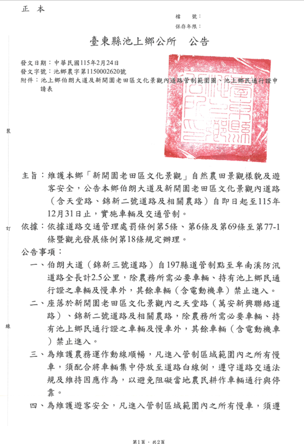 公告資訊 【轉知】臺東縣115年伯朗大道及新開園老田區文化景觀內道路車輛及交通管制公告 發布日期 2026/03/06~2026/04/06 | 發佈單位: 新聞處新聞行政科 | 發佈日期: 林先生 7531956分機1956 | 更新日期 2026/03/06 | 瀏覽人數: 13人