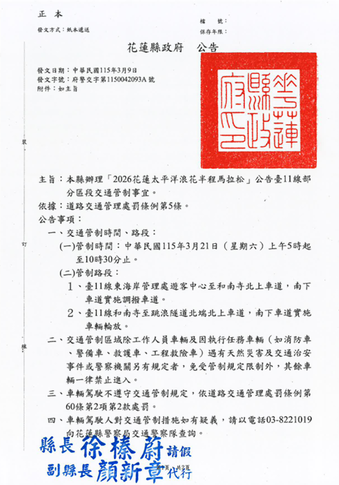 公告資訊 【轉知】花蓮縣政府「2026花蓮太平洋浪花半程馬拉松」交通管制公告 發布日期 2026/03/12~2026/04/12 | 發佈單位: 新聞處新聞行政科 | 發佈日期: 林先生 7531956分機1956 | 更新日期 2026/03/12 | 瀏覽人數: 20人