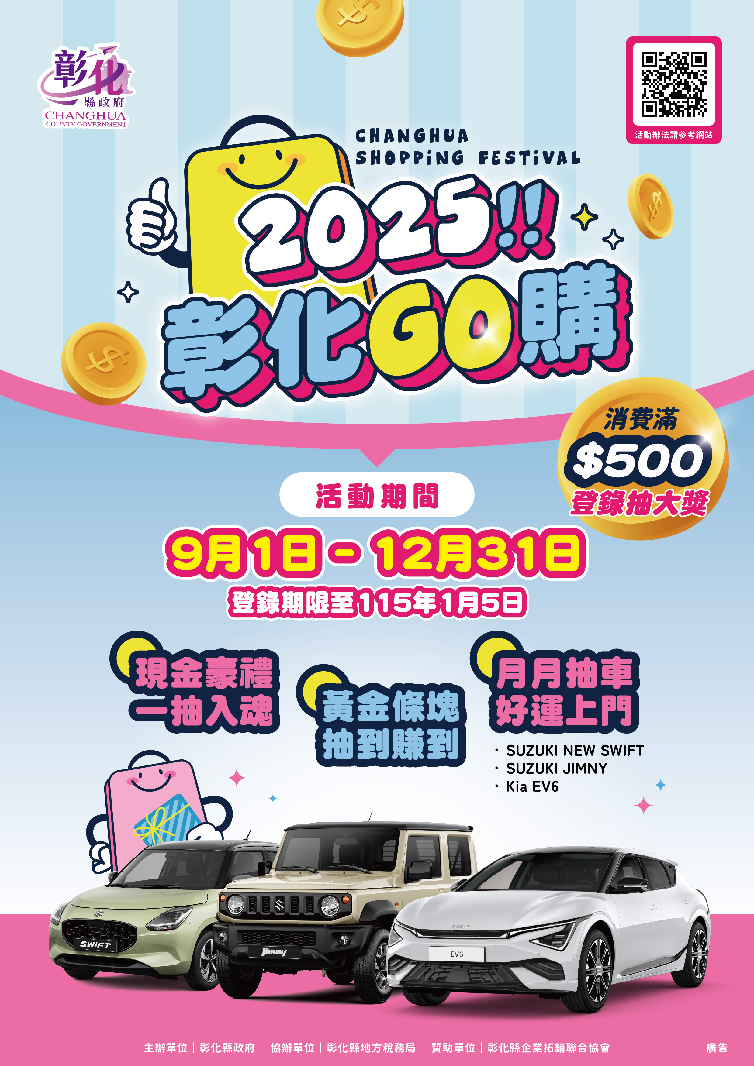 其他活動 「2025彰化GO購」開跑~消費就能抽百萬電動車 總獎項價值破千萬! 發布日期 2025/08/19~2026/01/07 | 發佈單位: 經濟暨綠能發展處 | 發佈日期: 林孟琪 7531146分機1146 | 更新日期 2025/08/19 | 瀏覽人數: 185人 活動名稱:2025彰化GO購消費抽獎活動 活動期間:114年9月1日至114年12月31日 登錄期間:114年9月1日至115年1月5日 活動內容:9月1日起,只要在彰化消費滿500元,憑發票、收據登錄,有機會抽中百萬電動車、還有黃金條塊、現金、雲端發票獎等獎項,通通讓你帶回家!