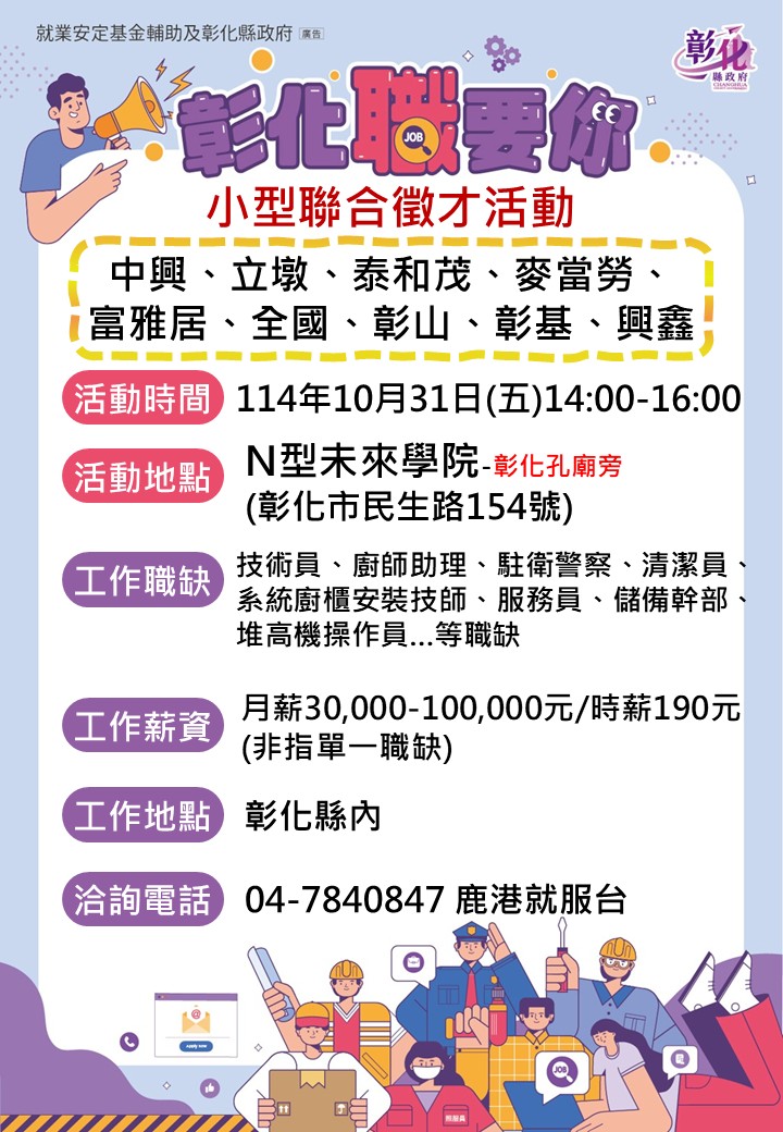 其他活動 🎉🎉🎉10/31小型徵才活動~~~ N型未來學院 發布日期 2025/10/01~2025/10/31 | 發佈單位: 勞工處就業服務科 | 發佈日期: 王靜儀 7840847 | 更新日期 2025/10/01 | 瀏覽人數: 10人 ◎活動時間:10/31(五)下午2時-4時 ◎活動地點: N型未來學院(彰化市民生路154號) ◎活動廠商:中興、立墩、全國、泰和茂、麥當勞、富雅居、彰山、彰基、興鑫 ◎活動職缺: 技術員、廚師助理、駐衛警察、清潔員、系統廚櫃安裝、技師、服務員、儲備幹部、堆高機操作員等…職缺 ◎薪資: 月薪30,000-100,000元、時薪190元 (非指單一職缺) ~~~~洽詢電話: 04-7840847 鹿港就服台~~~~ ◎廠商介紹: 1. 中興保全:以「中保無限+」服務體系為主軸,提供科技整合應用的服務。 2. 全國加油站: 上櫃上市(股票代號:9937)目前全省各縣市都有服務據點。 3. 彰基:目前台灣中部最大的醫學中心。 4. 麥當勞:當今全球規模最大的速食連鎖企業,以人為本是重要的核心價值。 5. 富雅居:營業項目:系統櫃/廚櫃/木製家具製造,經營理念為『用心服務』。 6. 泰和茂:營業項目:建築工程業,讓家成為理想生活實現心中夢想的基地。 7. 興鑫:營業項目:金屬製品製造業(熱處理加工),製程服務一條龍化控管。 8. 立墩:台灣一次性紙類和塑料包裝容器的領先製造商。 9. 彰山環保:彰基、漢銘等大型醫院指定配合洗地打蠟、病蟲害消毒工作。